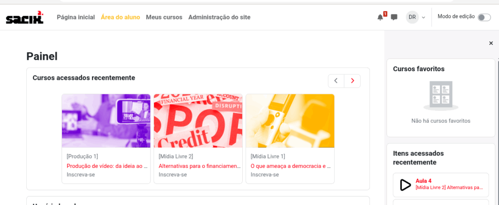 8 ) Ao acessar a “Área do aluno” você pode visualizar os cursos acessados recentemente, seus cursos favoritos e seus dados