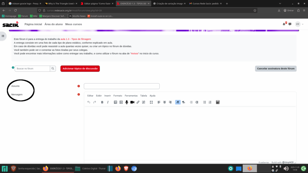 Cliclando em “Adicionar tópico de discussão”, aparecem as caixas de preenchimento “Assunto” e “Mensagem”: